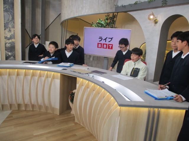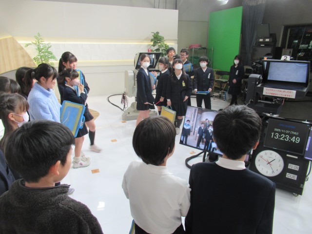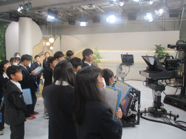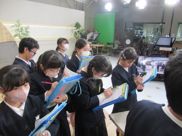 富山テレビ放送株式会社では、ニュースを発信するスタジオやバラエティー番組等を制作するスタジオ、中継車等を見学させていただきました。現職のアナウンサーの方が実際にニュース原稿を読み聞かせてくださったときには、子供たちは「すごい」「本物だ」と思わず言葉をもらしていました。