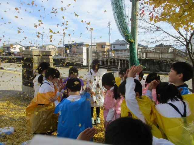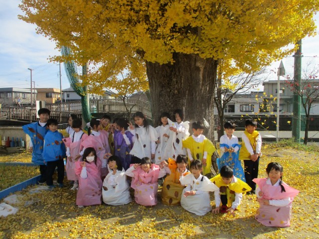 1組では、生活科の時間に秋の洋服づくりをしました。桜谷小学校の歴史のある木の下で、イチョウの落ち葉をシャワーのように降らせて遊び、楽しみました。