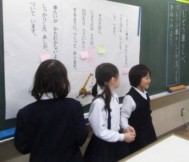 2組では、国語の時間にクレーン車の仕事とつくりについて考えを話し合い、まとめていました。