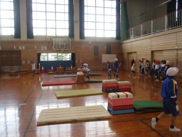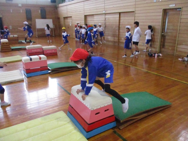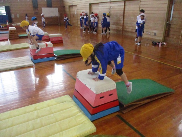 2年生では、跳び箱遊びの学習をしています。跳び箱の上に跳び乗ったり、乗った後に跳び下りたりして、跳び箱に慣れ親しんでいます。