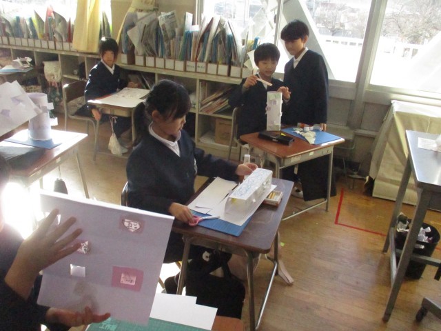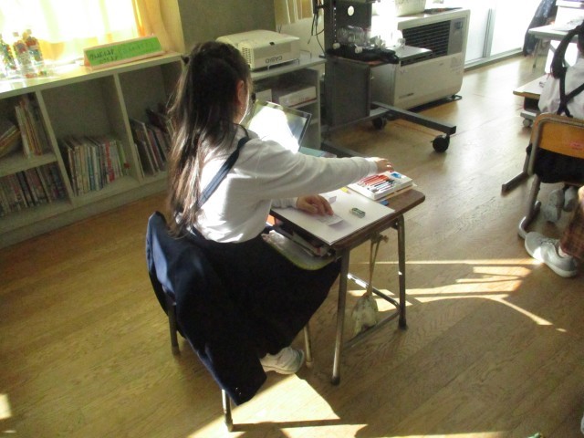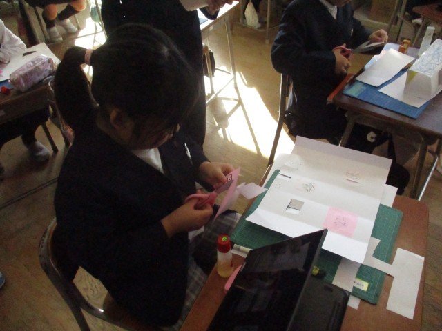2年生の図画工作科では、「窓のある建物」をカッターを使って作っています。窓の開け方や、開いた窓の奥に見えるものなどを考え、工夫して作っています。