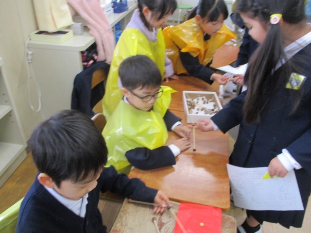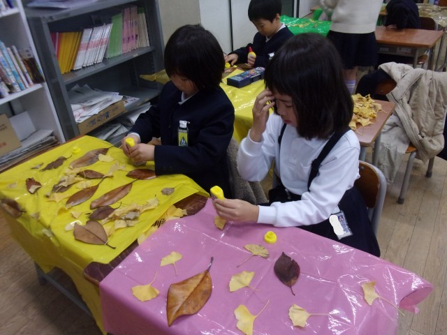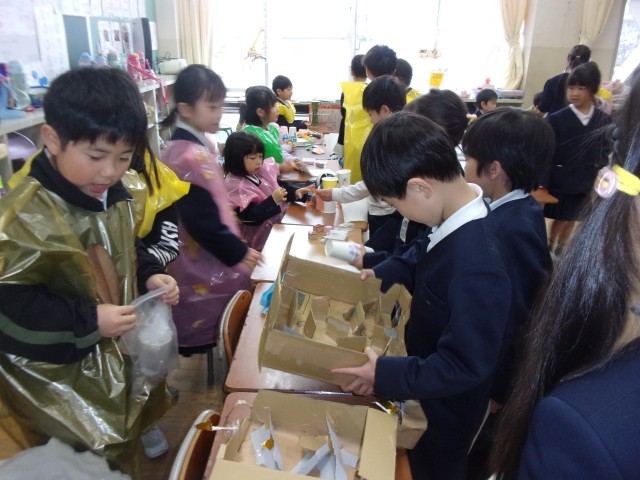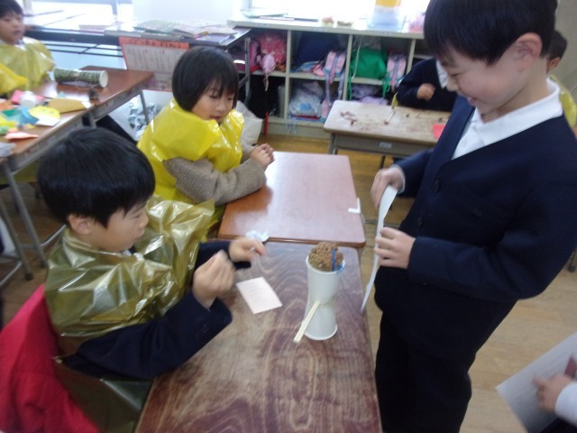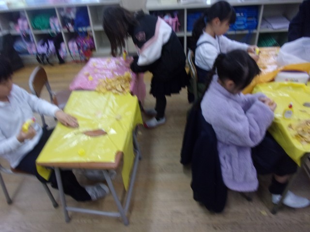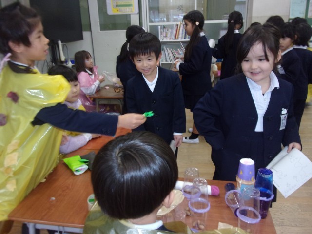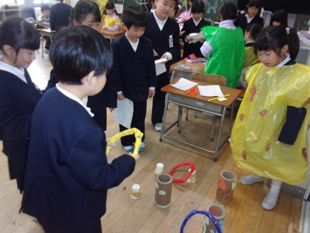 今日は、自分たちで作った秋のおもちゃランドに1組さんをご招待しました。この日に向けて、自分たちで招待状を書いたり、スタンプカードを作ったり、教室の見取り図を書いたり、お金を作ったりとアイディアを出し合って準備を進めてきました。グラウンドの葉っぱを袋に付けて作った洋服を着て、お店屋さんごっこを楽しんでいました。いろいろな材料の準備等、ご協力ありがとうございました。