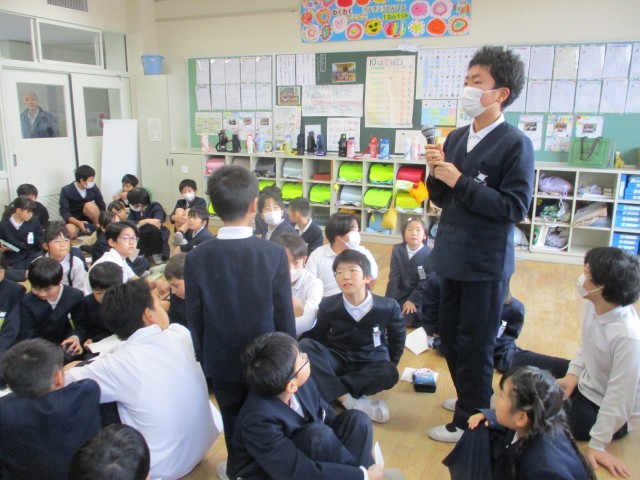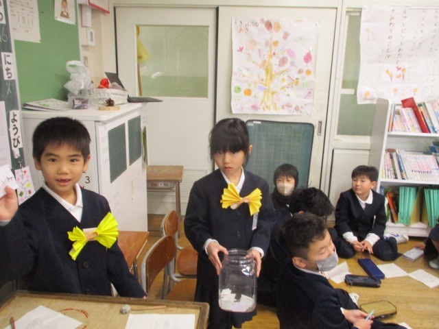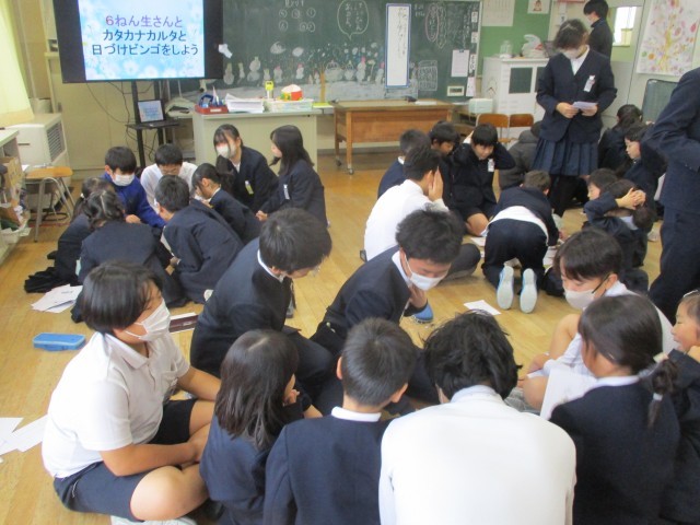 国語科の学習で、カタカナを使った文を考えて「カタカナかるた」を作りました。今日は、6年生と一緒に「カタカナかるた」や「日づけビンゴ」をして、楽しく交流をしました。6年生が1年生に優しくする様子や1年生が喜んでカタカナの言葉を伝える様子が見られ、1年生はとても満足げな様子でした。