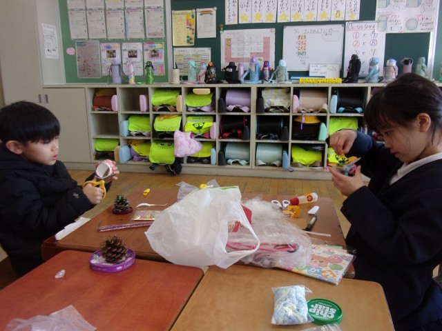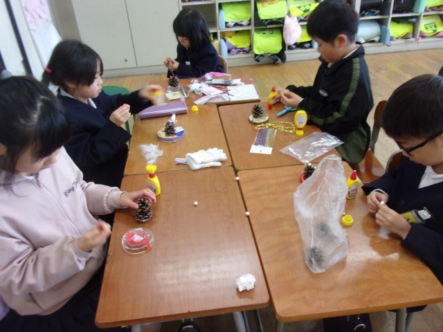 図画工作科では、校外学習で拾ってきた松ぼっくりをツリーに見立てて可愛く飾りつけをしました。仕上がった作品は廊下に飾っておりますので、懇談会の際にぜひご覧ください。来週持ち帰りますので、ぜひお家に飾ってクリスマスをお迎えください。材料を準備してくださり、ありがとうございました。