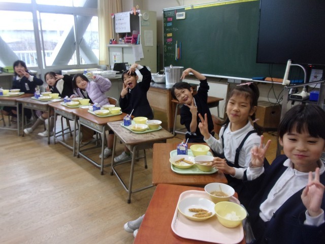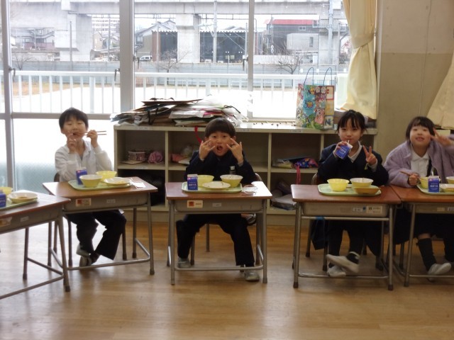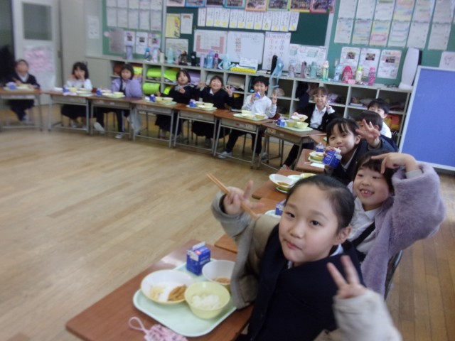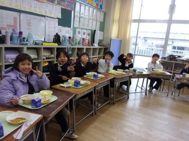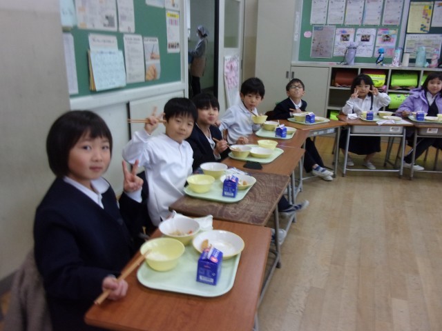 今日の給食は、みんなで大きな輪になって食べました。にこにこ笑顔の子供たちです。