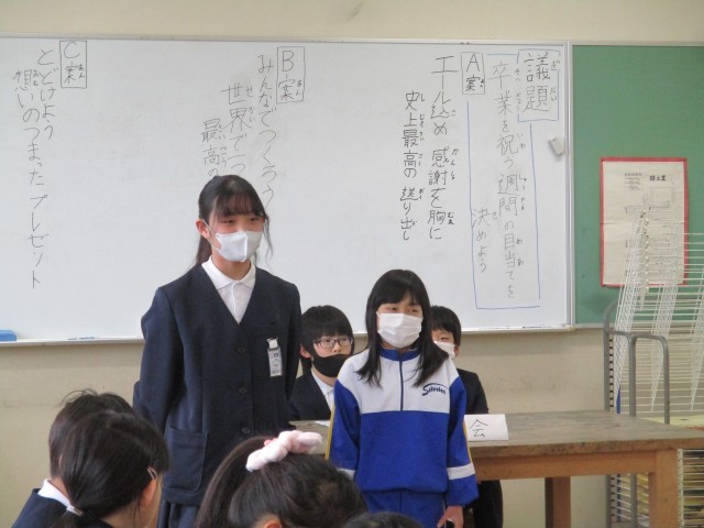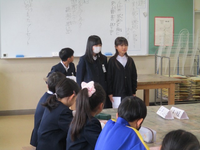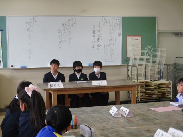 6年生の卒業を祝う週間に向けて、プロジェクトが始動しました。「6年生に感謝の気持ちを伝えたい」「中学校に進学する6年生を応援したい」などと思いをもち、どんな週間にするか話合いを進めています。今日は、代表委員会を開き、5年生で考えた目当ての案を各クラスの代表に伝えました。目当てに込めた思いをしっかりと伝え、来週の在校生会議に備えました。
