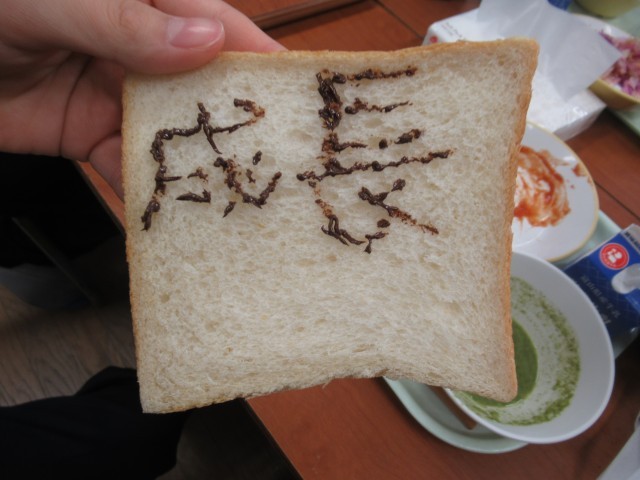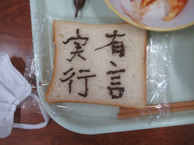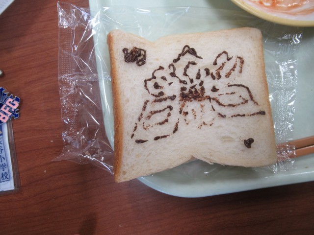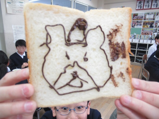 子供たちは、チョコペンを使ってパンに絵や文字をかき、楽しく、おいしく食べていました。