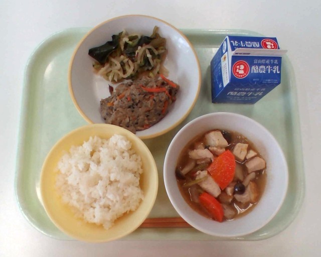 海のサラダは、スイミーが海底で出会った海藻たちをイメージしています。また、大きなかぶの煮物は1年生で学習する「おおきなかぶ」をイメージしています。今日のかぶは、富山県魚津市で作られました。地域の作物を全校でいただきました。
