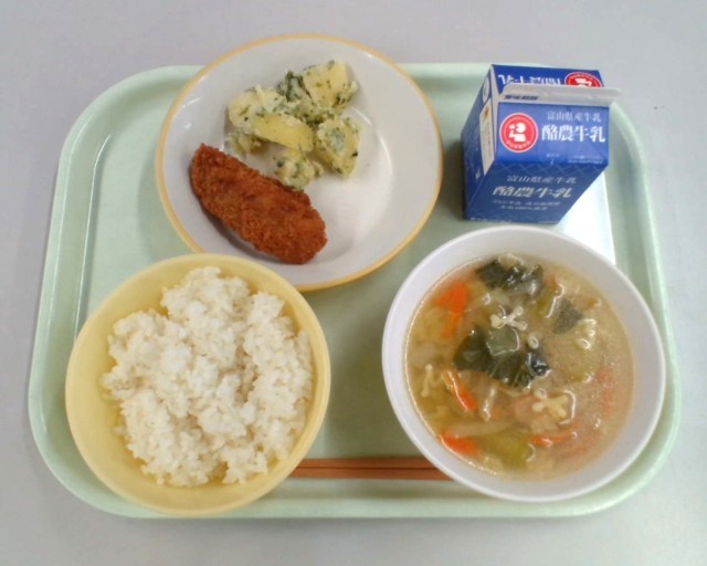ごはん、牛乳、白身魚のフライ、チーズポテト、ABCマカロニスープ