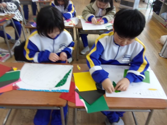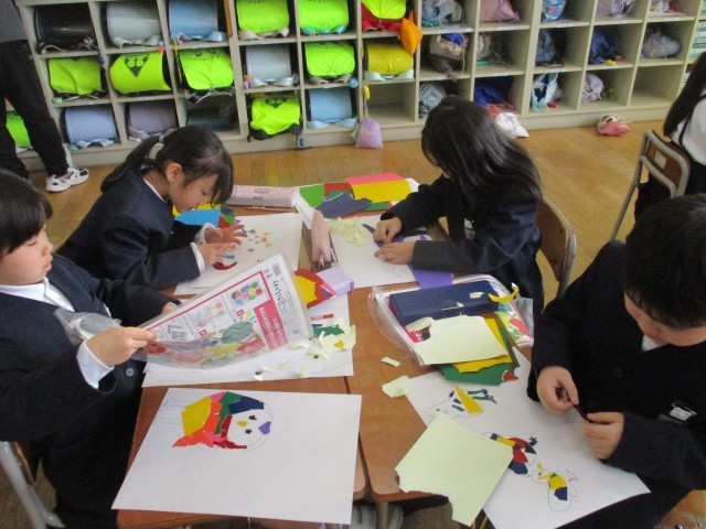 図画工作で、カラフルな動物を版画で表現しました。図鑑を使って動物の形をよく見ながら下絵を描き、その上にカラフルなシールをペタペタと貼っています。思い思いの作品に仕上がりました。学習参観の際に、ぜひご覧ください。