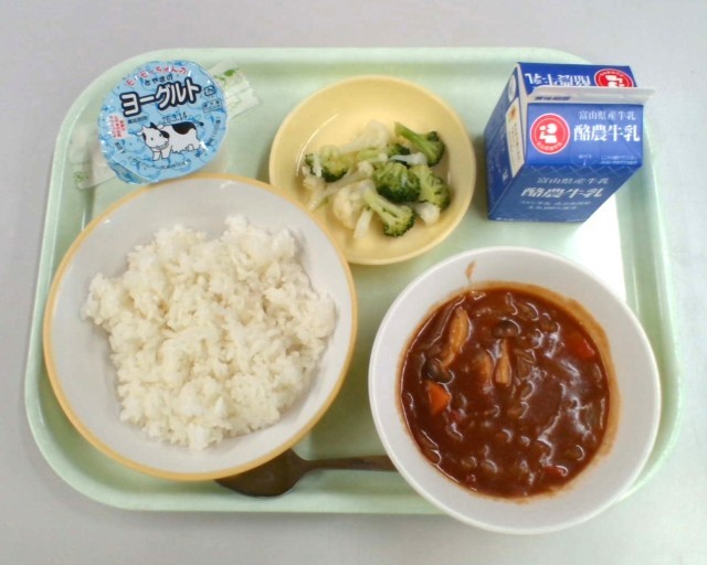 今日の給食は、たべキリンハヤシです。たべキリンハヤシは「おいしいとやま食べきり運動」の一つとして作られた富山市オリジナルのレシピです。街中でたべキリンのポスターやイラストを見たことがある方も多いのではないでしょうか。