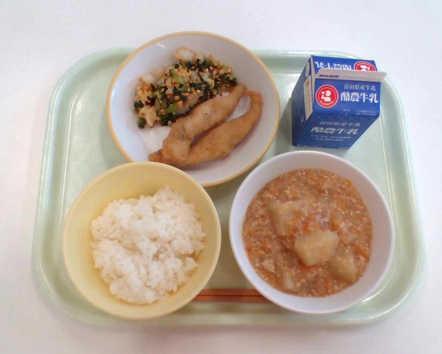 ごはん、牛乳、ししゃもフライ、炒り大豆和え、じゃがいものそぼろ煮
