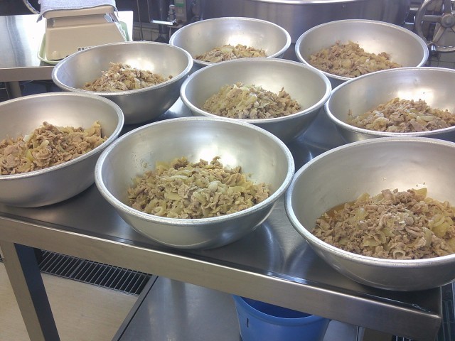 写真(下)は、調理室での「配缶」の様子です。クラスごとに、出来立てのポークソテーを丁寧に盛り分けています。