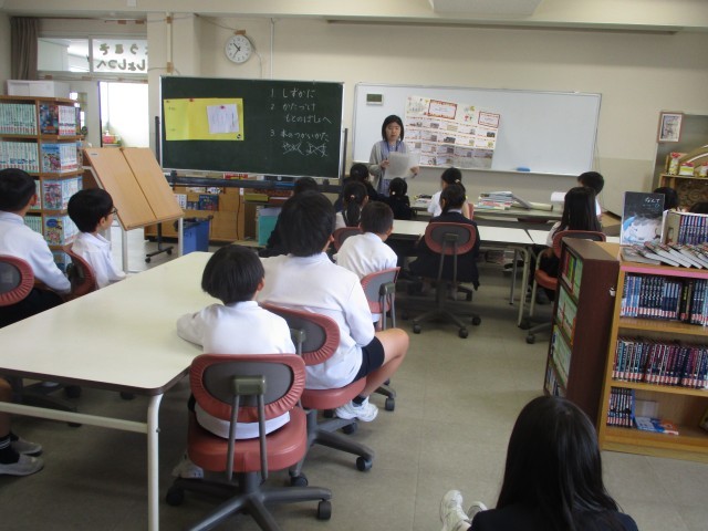 図書室を使うときの手順や注意点について、説明を受けました。説明後、本を借りて読書を楽しみました。