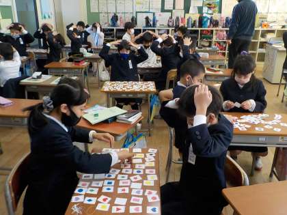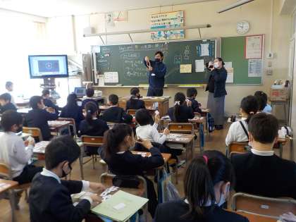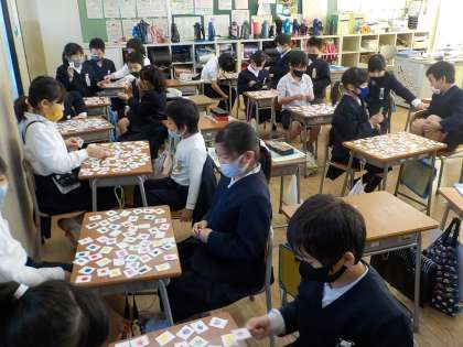 今日から、色と形を表す英語の学習が始まりました。カードを使って、三角形や、円、星形、正方形等を表します。二人組で聞き取るゲームをしながら、楽しそうに学習に取り組んでいました。