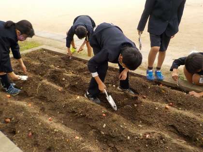 今日の委員会活動の時間、花壇にチューリップの球根を植えました。色合いについても、どのように並べればよいかを話し合いました。来春、どんな花が咲くのか楽しみです。