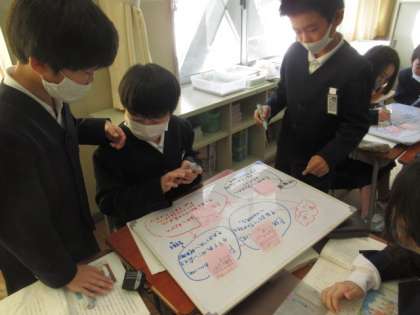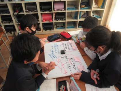 「プラタナスの木」に登場する「マーちん」にとってのプラタナス公園について話し合いました。自分の考えをまとめたあと、KJ法でホワイトボードに班のみんなの考えを整理していきます。分類すると考えが比較でき、友達の意見とのつながりに気付くことができました。