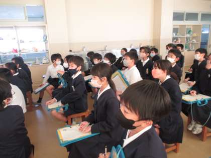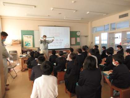 「移動下水道教室」をしていただきました。桜谷から浄化センターまで下水が3時間以上かけて流れていくこと、そこからさらに12時間かけて汚れた水をきれいにすることを知った子供たちはとても驚いた様子でした。下水道の正しい使い方を学ぶことができました。
