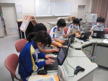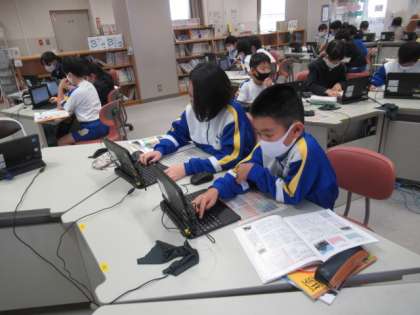 2学期の社会科の学習では、郷土の発展に尽くした人物の功績や出来事について学んできました。まとめとして、心に残ったテーマを1つ選び、スライドにまとめています。自分の思いや大事な言葉を選びながら作成しています。