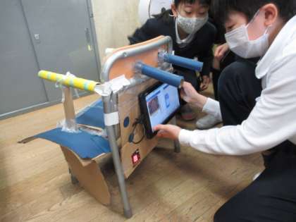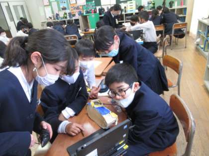 総合で取り組んできた商品づくりがいよいよ完成に近づいています!今日は、コンピュータと作った商品の型を合体させて、動かしてみました。教室へ初めてパソコンを持ち出し、会社ごとに使用しました。