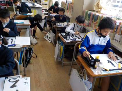 いよいよ書き初めの練習が始まりました。今日は、「書き初め」の意味について学びました。心を落ち着けて、正しい姿勢で書くことはこれまでと変わりません。ひらがなのやわらかい感じを意識しながら、まずは、半紙に書いてみました。写真からも集中して書いている雰囲気が伝わってきます。