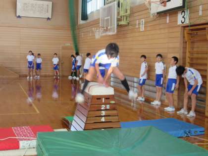 子供たちが取り組んでいる技は、「開脚跳び」「抱え込み跳び」「台上前転」等です。