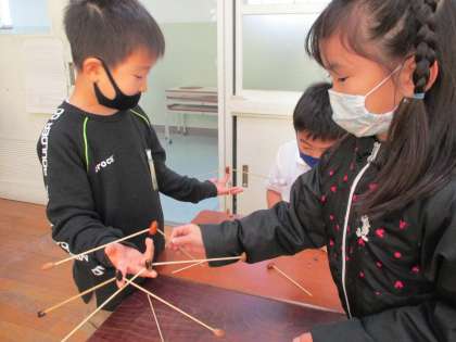 今日は、みんなで作った秋のおもちゃで遊びました。友達の作ったおもちゃを試してみて「○○さんのおもちゃは、どんぐりがよく転がっておもしろいよ」「△△さんのくじびきは、どきどきするよ」とお互いのおもちゃのおもしろさに気付いていました。今日と明日、作ったものを持ち帰ります。材料の準備等ありがとうございました。