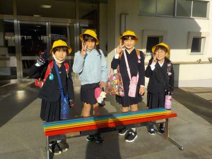 さっそく出来上がった虹色のベンチを職員玄関前に置くと、多くの子供たちが立ち止り、座っていました。どの子の顔も笑顔になっていました。