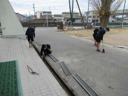 廊下をほうきで掃いている子供や、溝さらいをしている子供など、学校の至るところでがんばっている姿が見られます。