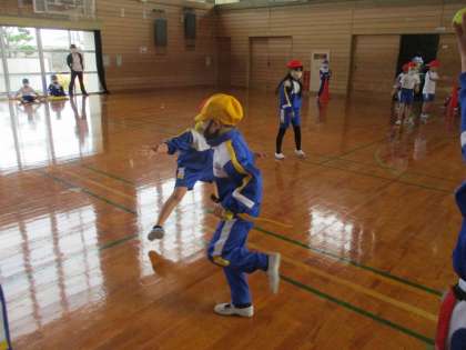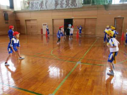 体育は、しっぽとりゲームをしています。ねずみがチーズをゲットしてねこに捕まらずに自分の家へ帰るというゲームです。いろいろな作戦を考えながら、団ごとに実践しています。ぎゅんぎゅん作戦、すきま作戦、反復横跳び作戦などおもしろい作戦ばかりです。