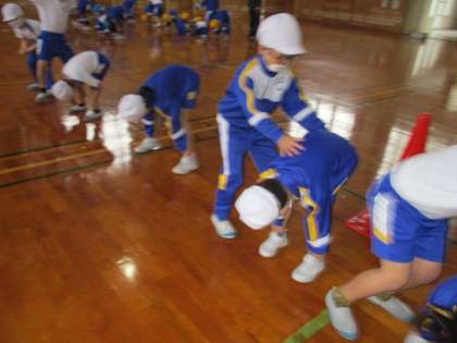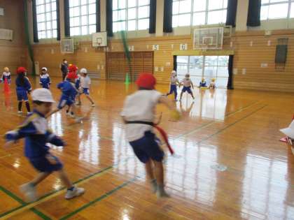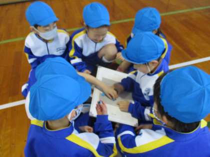 今日の体育館はとても寒かったので、みんなで馬跳びをして体を温めてからチーズゲットゲームに取り組みました。作戦板を使って、守りの動きを考えた後にゲームをしました。大胆な作戦や堅実な作戦など、その団ごとの個性が見られました。みんな、寒さに負けずがんばっています。