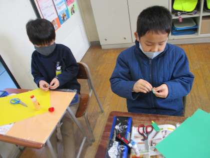 図画工作で、かわいいかわいい「すきまちゃん」を作りました。自分の作った「すきまちゃん」を教室内のいろいろな隙間に挟ませて遊びました。「すきまちゃん」は今日お家へ持ち帰ったので、もしかしたらお家のどこかの隙間に現れるかもしれません。