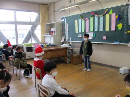 出し物は、それぞれの係が一生懸命に準備してきました。クリスマスにちなんだクイズや飾り付けなど、工夫もたくさん見られました。終わりには「みんなでがんばったね。楽しかったね。またしようね。」と声を掛け合う子供たちでした。1年1組の素敵な思い出になりました。