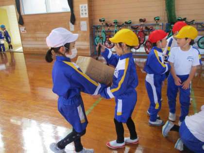 体育で使った用具をてきぱきと片付けています。友達と協力して仲良く素早く片付けている様子に子供たちの成長を感じます。