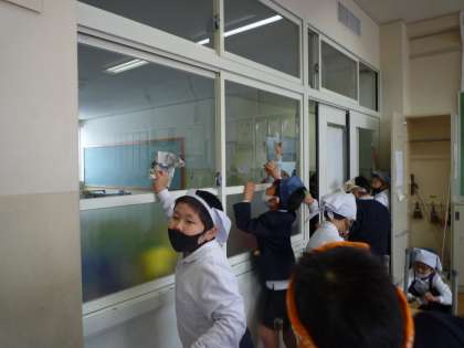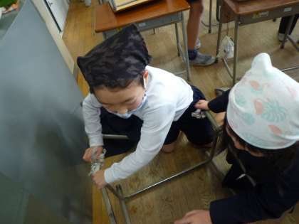 掃除の時間の様子です。新聞紙を使って、隅々まできれいにしています。