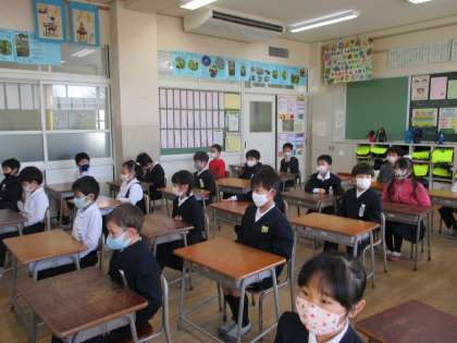終業式は、放送で行われました。真剣な表情で校長先生のお話にしっかりと耳を傾けていた1年生です。