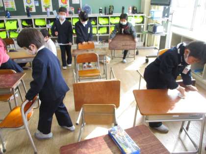 2学期最終日とあって、教室や自分たちで使った場所の大掃除をしました。まずは、毎日使った自分の机と椅子です。心を込めて丁寧に拭きました。