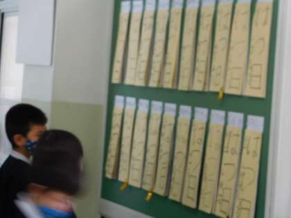 8日に学校に来た際の書き初め大会の結果を振り返りました。みんな自分のと周りの子の書き初めを振り返り、褒め合ったり、ニコニコしながら作品を見ていました。