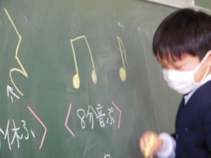 音楽の学習では、2学期の復習で音符の名称や役割や書き順を復習しました。