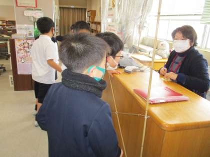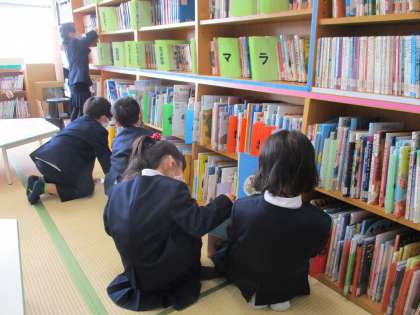 冬休み中に借りていた本を返却し、3学期初めて図書室へ行って本を借りました。1年生の子供たちは、本が大好きです。冬休み中には、親子読書の時間を設けてくださり、ありがとうございました。「お家の人に絵本を読んでもらっておもしろかった!」「ぼくが読んであげたら、お母さんがうれしそうだった」等の声が聞かれました。3学期は、これまで手に取ったことのない、いろいろなジャンルの本にも親しんでもらえるとうれしいです。