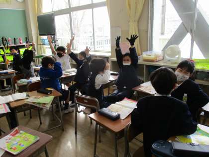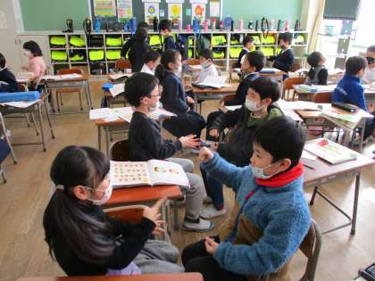 音楽の学習で「わらべうた」を歌いました。わらべうたとは、日本に昔から伝わる歌のことです。席替えをして新しいペアの友達と一緒に楽しく「おちゃらかほい」をしました。