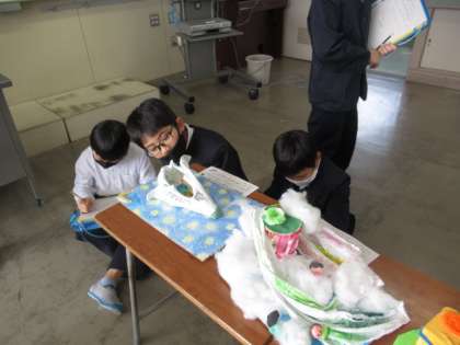 液体粘土を使って作った作品を鑑賞し合いました。細かい所までこだわって作ってある友達の作品を、いろんな方向からのぞいてみたり、友達が作りたかった世界を想像したりしながら、面白いところやすてきなところを見つけていました。