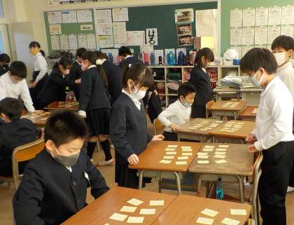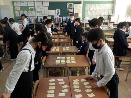 冬休み中や臨時休校中にも、百人一首を覚えようとがんばった3年生は多かったようです。練習した様子は、空気で伝わってきます。上の句5文字で、「はい」という声があちらこちらから聞こえるようになっています。「読みます」の声で、しーんと水を打ったように静まり、集中している眼差しを見ていると、いいなと思います。勝っても負けても、楽しかったと言える3年生が素敵です。