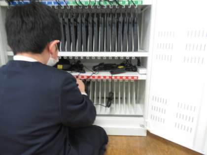 教室に入ってきたパソコンを充電保管庫の中で、コードをつなげました。子供たちは、よく話を聞いて、順番に自分が使う予定のパソコンの準備を進めていました。いよいよ端末を使った学習が始まることを感じ、わくわくした様子でした。