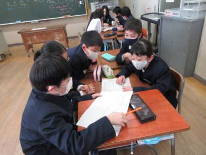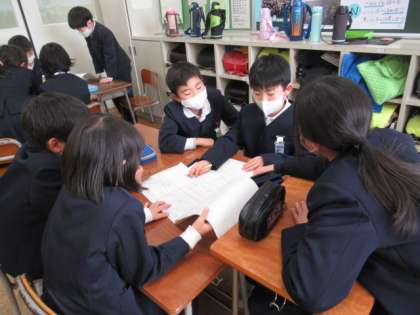 3学期の総合は、「商品開発プロジェクトを通して、自分たちの思いを伝えよう」がテーマです。今日はどんな発表の流れにするのかを会社ごとに話し合いました。効果的に自分たちの思いが伝わるように、工夫して案を考えていました。
