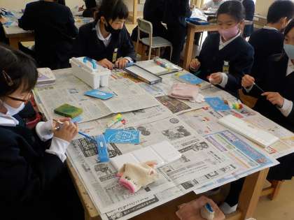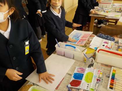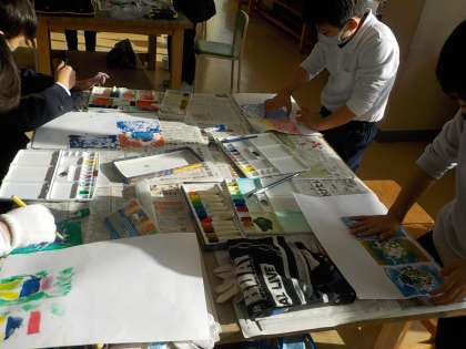 図画工作科では、版画にチャレンジしています。今日は、試しに何回か刷ってみました。水彩絵の具で、彩色したのですが、思いがけない効果があったり、色によってイメージが違ったりしていて、みんな楽しく取り組めたようです。次回も楽しみです。