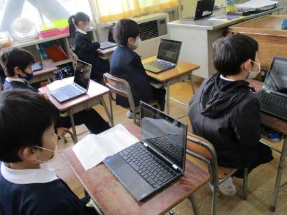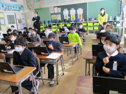 今日もパソコンをしました。クロームブックのキーボードを自分で打ち、桜谷小学校のホームページを検索して1年生のページをみんなで見ました。「わあ、写真が大きくなる!」「あ、ぼくが写ってる!」とうれしそうな様子でした。また、QRコードを読み取って、「たぬきの糸車」の動画を見ました。「本当に糸車が、キークルクルっていってる!」と驚いていました。今日1日でいろんなことに挑戦した子供たち。とても満足そうでした。