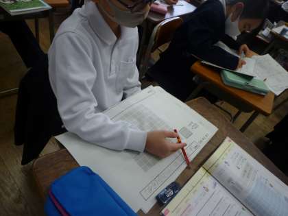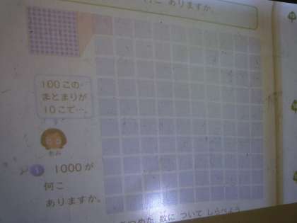 算数では、「1000より大きい数をくらべよう」の学習をしています。今日は、100のまとまりをかけ算で計算し、1万まで求められることを学びました。大きな数のまとまりをどういう計算をしたら1万になれるかを考えて意見を発表していました。