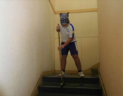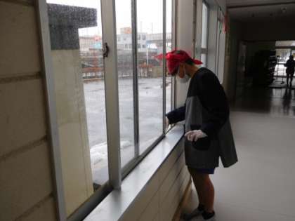 六年間、お世話になった校舎へ感謝の気持ちを届けようと、家庭科の学習で清掃活動を行いました。身支度や清掃の手順、道具など、今までの学習を生かし取り組みました。