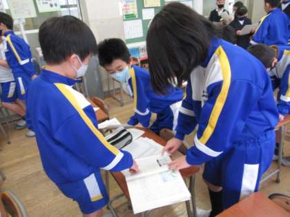 「ウナギのなぞを追って」では、自分の興味のもったことを中心に、Q&Aにしてまとめています。今日は同じテーマの友達と、まとめたものを見合い、意見を言いました。教科書の文を読み直したり、言葉を言い換えたりしながら工夫していました。